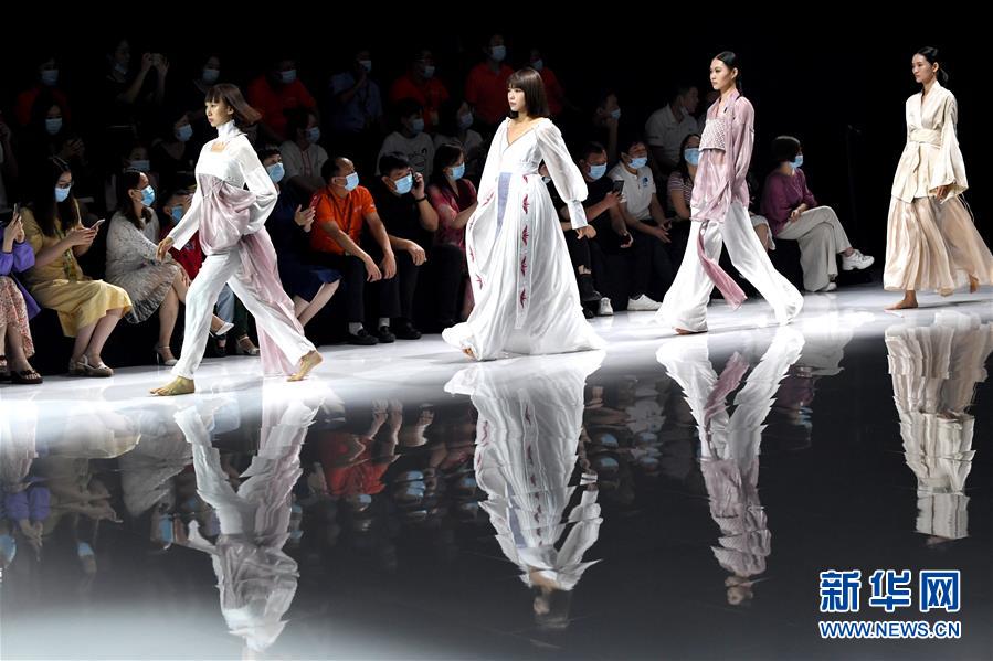 8月6日,模特在時裝秀上展示時裝。當日,2020中國(河南)國際大學生時裝周舉行河南大學生優秀服裝設計專場展示。8月5日至7日,2020中國(河南)國際大學生時裝周在河南省新密市豫發密蘭小鎮舉行。新華社記者朱祥攝