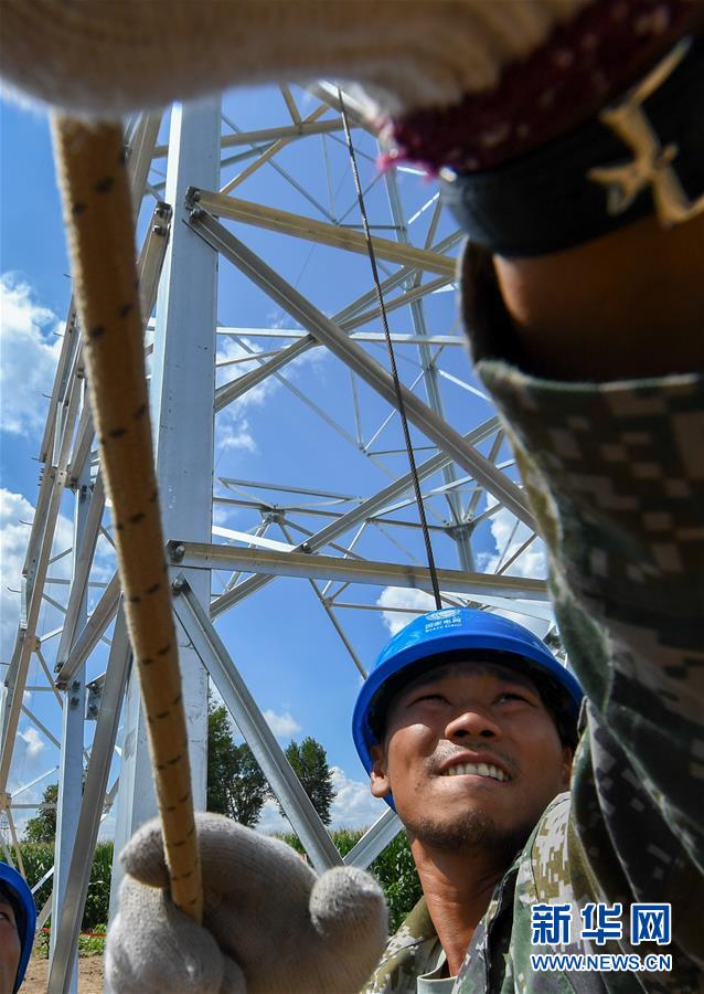 8月6日,送電工在吉林省長春市城郊的一處輸電鐵塔上施工作業(yè)。吉林省長春市連續(xù)多日出現(xiàn)高溫天氣,國網(wǎng)長春供電公司輸電運(yùn)檢中心的送電工們每天清晨開始作業(yè),不畏烈日“烤”驗(yàn),堅(jiān)守工作崗位,確保工程按計(jì)劃完成。新華社記者張楠攝
