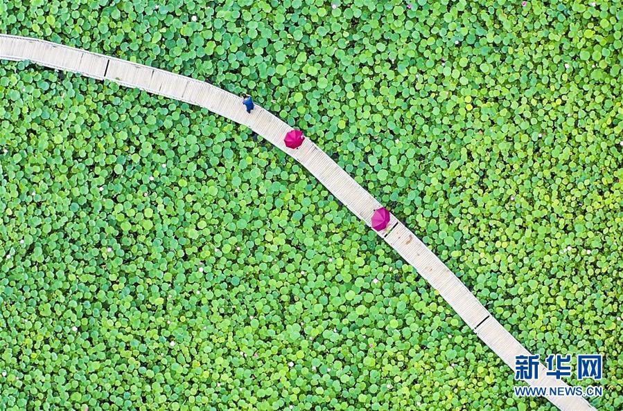 8月6日,游客在河北省永清縣里瀾城鎮(zhèn)金華湖觀賞荷花(無(wú)人機(jī)照片)。夏日時(shí)節(jié),河北省永清縣里瀾城鎮(zhèn)金華湖荷塘的荷花爭(zhēng)相開(kāi)放,吸引市民和游客前來(lái)游玩觀賞。新華社記者李曉果攝