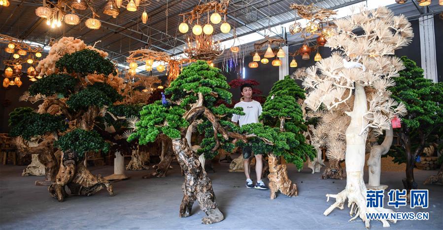 這是8月7日在永福縣永安鄉(xiāng)根雕工藝品就業(yè)扶貧車間拍攝的根雕工藝品。2017年以來,廣西桂林市永福縣永安鄉(xiāng)通過幫扶返鄉(xiāng)青年創(chuàng)業(yè)的方式,建立起根雕工藝品就業(yè)扶貧車間,組織貧困群眾進車間務(wù)工學藝,把當?shù)刎S富的朽木和柑橘樹根枝資源利用起來,加工成盆景、茶桌、吊燈等根雕工藝品,不僅幫助貧困群眾在家門口掌握一技之長,還讓他們在脫貧摘帽后實現(xiàn)穩(wěn)定增收。新華社記者張愛林攝
