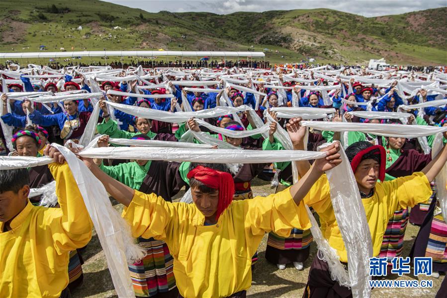 8月7日,在西藏首屆弦子舞展演現場,演出人員在表演弦子舞。當日,西藏首屆弦子舞展演在昌都市芒康縣舉行。眾多演員同臺獻藝,表演國家級非物質文化遺產弦子舞,吸引西藏各地的群眾前來觀看。新華社記者孫非攝