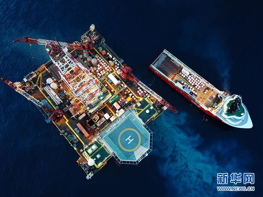 這是7月29日拍攝的正在南海北部海域進行鉆探作業的勘探三號鉆井平臺和為其運送物資的拖船(無人機照片)。新華社記者蒲曉旭攝