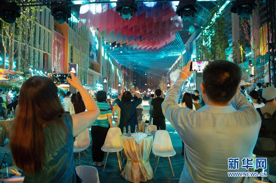 8月8日晚,市民在望京小街商業街觀看燈光秀。新華社記者 陳鐘昊 攝