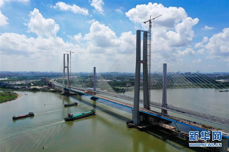 8月9日拍攝的廣州南沙港鐵路跨西江特大斜拉橋最后一塊鋼箱梁吊裝施工現場(無人機照片)。當日,中鐵十一局承建的粵港澳大灣區基礎設施“硬聯通”重點工程——廣州南沙港鐵路跨西江特大斜拉橋完成最后一塊鋼箱梁吊裝作業,大橋即將合龍。該橋位于廣東佛山市和江門市交界處,全長1117.5米。新華社記者劉大偉攝。