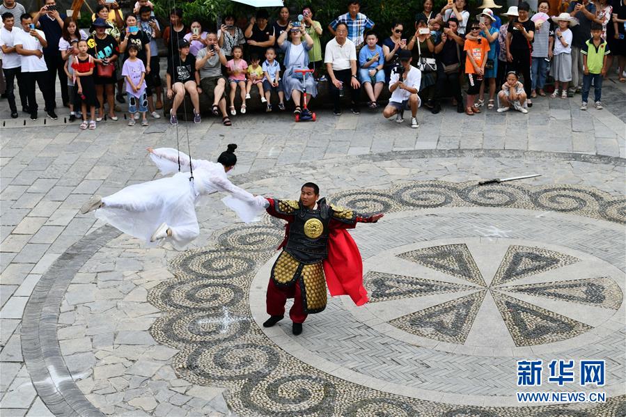 8月8日,游客在貴州省龍里縣“龍門鎮”武俠文化主題景區觀看武俠劇表演。近日,貴州省黔南布依族苗族自治州龍里縣境內氣候宜人,龍里油畫大草原、“龍門鎮”武俠文化主題景區等景點吸引眾多游客前來觀光旅游。新華社記者楊文斌攝。