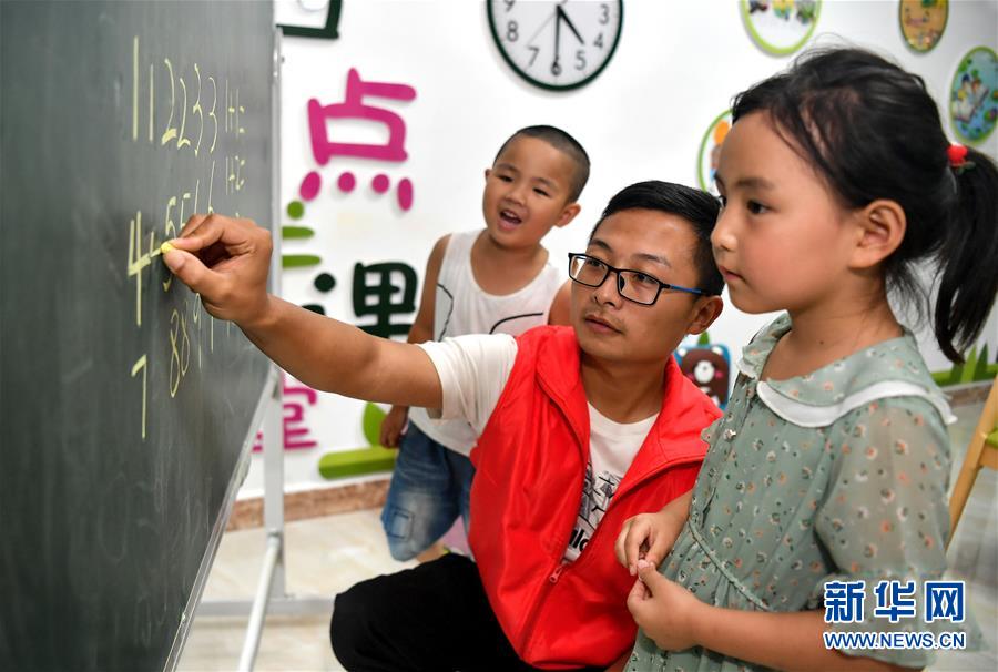 陜西安康市嵐皋縣城關鎮城北易地扶貧搬遷安置小區“四點半課堂”的老師在輔導孩子們學習數字(7月29日攝)。地處秦巴山區的嵐皋縣山多溝深,群眾居住分散,長期以來易地搬遷成為這里脫貧攻堅的重點。為避免易地搬遷群眾就業不充分、辦事不方便、管理不到位等問題,嵐皋縣依托市場完善社區生活、醫療、教育、娛樂等服務設施,并開展技能培訓、開辦社區工廠,讓搬遷居民“穩得住”“能致富”。新華社記者劉瀟攝。