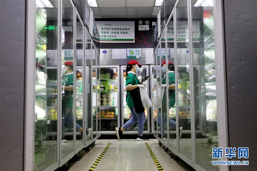 工作人員在叮咚買菜一家前置倉內為網絡訂單配貨(7月17日攝)。近年來,在上海崛起了一批以盒馬、叮咚、拼多多為代表的在線經濟新力量,在助力脫貧攻堅、提升城市居民品質生活方面發揮著重要作用。電商加持下的“云農業”加速發展,一端為市民提供更便宜新鮮的農產品,另一端讓山區的優質產品加速進入城市餐桌,化解交通不便、農產品滯銷等問題。新華社記者方喆攝。