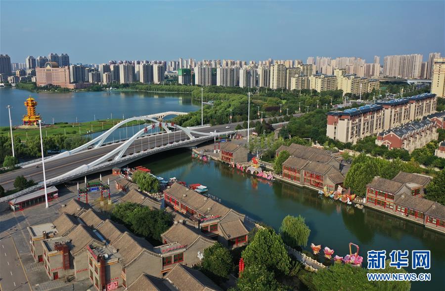 8月9日拍攝的唐山市豐南區唐津運河景色(無人機照片)。近年來,河北省唐山市豐南區全力推動“全域治水、清水潤城”工程,形成了以唐津運河、人民公園生態廊道等以健身、休閑、旅游功能于一體的人水相親、城水相依的景觀環境,為綠色發展注入活力。新華社記者楊世堯攝。