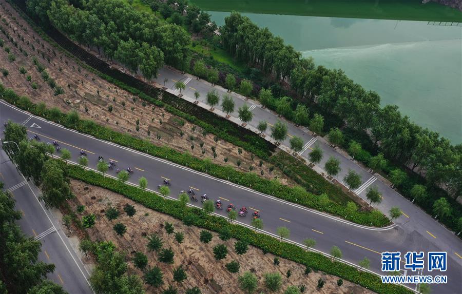 自行車愛好者在唐山市豐南區唐津運河景觀大道騎行(7月31日攝,無人機照片)。近年來,河北省唐山市豐南區全力推動“全域治水、清水潤城”工程,形成了以唐津運河、人民公園生態廊道等以健身、休閑、旅游功能于一體的人水相親、城水相依的景觀環境,為綠色發展注入活力。新華社記者楊世堯攝。