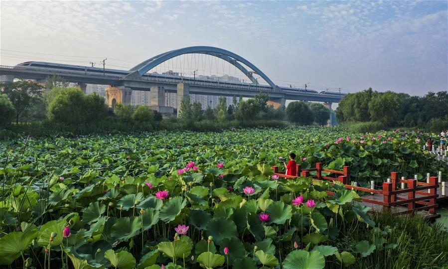 市民在唐山市豐南區人民公園欣賞荷花(7月25日攝,無人機照片)。近年來,河北省唐山市豐南區全力推動“全域治水、清水潤城”工程,形成了以唐津運河、人民公園生態廊道等以健身、休閑、旅游功能于一體的人水相親、城水相依的景觀環境,為綠色發展注入活力。新華社記者楊世堯攝。