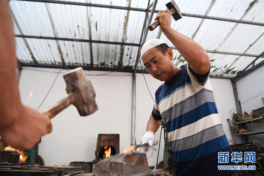 8月10日,甘肅省臨夏回族自治州積石山縣大河家鎮的村民馬維正在制作保安腰刀。新華社記者陳斌攝。