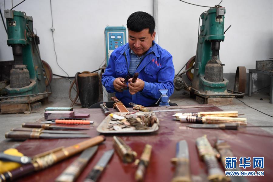 8月10日,在甘肅省臨夏回族自治州積石山縣大河家鎮,國家級非物質文化遺產代表性項目保安族腰刀鍛制技藝傳承人馬尕主麻在查看鍛制好的保安腰刀。新華社記者陳斌攝。