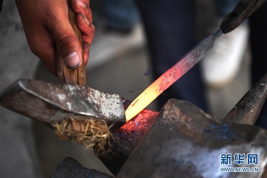 8月10日,甘肅省臨夏回族自治州積石山縣大河家鎮的村民馬有虎在制作保安腰刀。新華社記者陳斌攝。