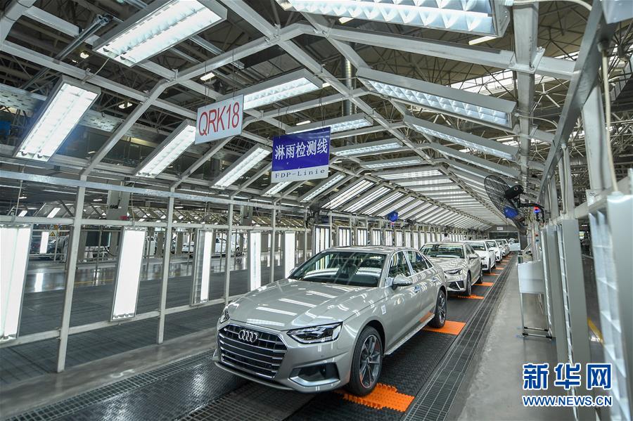 8月10日,在一汽-大眾長春基地總裝車間,裝配好的車輛接受淋雨測試。中國第一汽車集團有限公司7月銷售整車32.2萬輛,同比增長23.2%,延續上半年的增長態勢。新華社記者張楠攝。