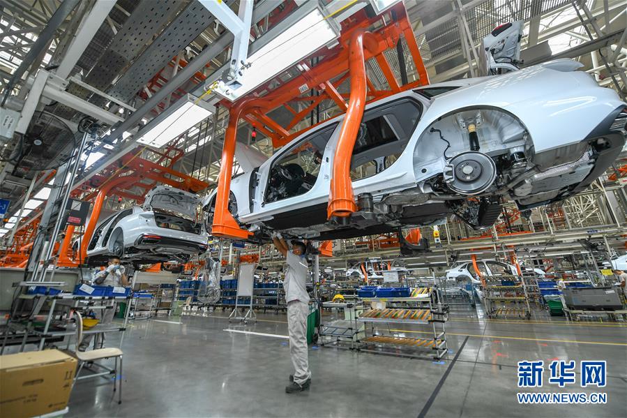 8月10日,在一汽-大眾長春基地總裝車間,工人在裝配車輛。中國第一汽車集團有限公司7月銷售整車32.2萬輛,同比增長23.2%,延續上半年的增長態勢。新華社記者張楠攝。