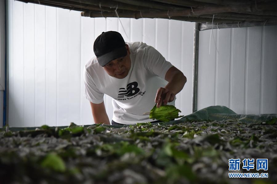 在貴州省畢節(jié)市納雍縣勺窩鎮(zhèn),納雍縣瑞慧桑蠶養(yǎng)殖發(fā)展有限責(zé)任公司負責(zé)人在查看桑蠶飼養(yǎng)情況(7月21日攝)。新華社記者駱飛攝。