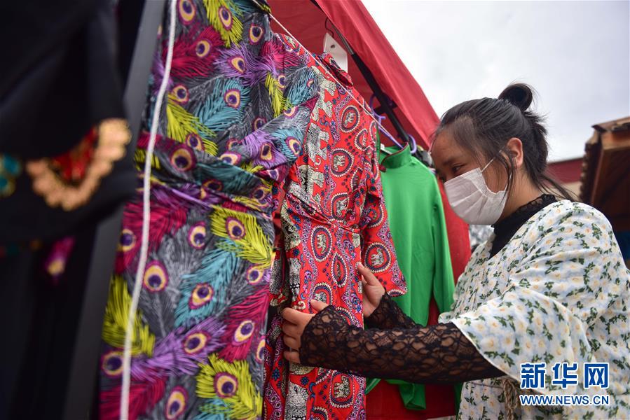 8月11日,尖扎縣昂拉鄉德吉村村民在自家經營的藏裝店內整理服裝。新華社記者張龍攝