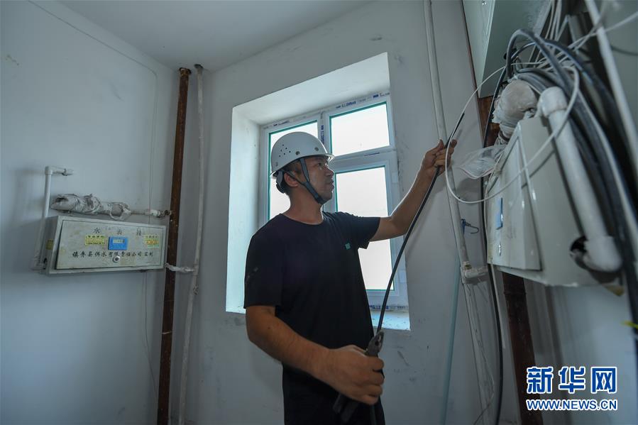 8月11日,工人在鎮賚縣慶余社區一老舊小區內改造樓內線路。2019年底開始,吉林省白城市鎮賚縣對超過20年房齡的老舊小區進行全面改造升級,優先完成樓體內外墻面、樓頂防水、道路硬化工程,并協調各職能部門對地下管網、綠化美化等基礎設施問題進行統籌施工,減少后期二次施工造成的環境破壞和資源浪費。一期工程預計于今年10月完工,施工完成后,政府相關部門將為這些小區統一配備物業公司,解決后期設施維護問題。新華社記者張楠攝