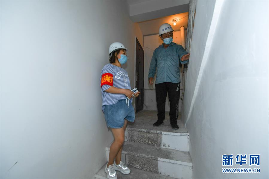 8月11日,在鎮賚縣慶生社區一老舊小區內,工程監理和社區網格員檢查改造后的樓內設施。2019年底開始,吉林省白城市鎮賚縣對超過20年房齡的老舊小區進行全面改造升級,優先完成樓體內外墻面、樓頂防水、道路硬化工程,并協調各職能部門對地下管網、綠化美化等基礎設施問題進行統籌施工,減少后期二次施工造成的環境破壞和資源浪費。一期工程預計于今年10月完工,施工完成后,政府相關部門將為這些小區統一配備物業公司,解決后期設施維護問題。新華社記者張楠攝