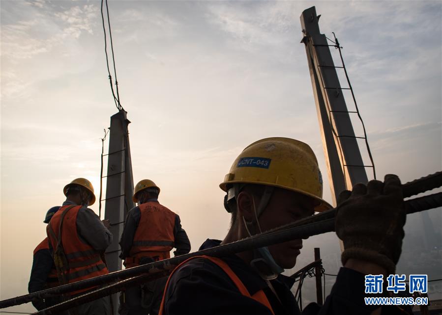 8月11日傍晚,工人在武漢綠地中心項目建設現場近500米的高空施工。新華社記者肖藝九攝