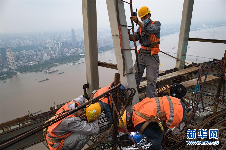 8月11日,工人在武漢綠地中心項目建設現場近500米的高空施工。新華社記者肖藝九攝