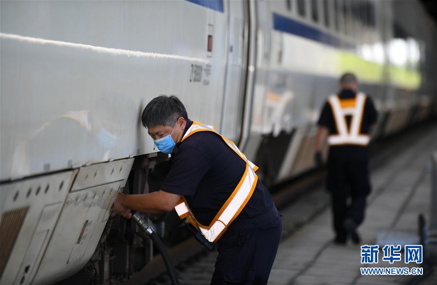 8月12日,長春火車站客運(yùn)車間上水工王軍在給列車上水。進(jìn)入暑運(yùn)高峰,為了保障列車正常用水,每當(dāng)一列火車停靠車站,長春火車站的上水工就冒著酷暑將水管插進(jìn)火車底部的輸水口,快速準(zhǔn)確完成輸水作業(yè)。新華社記者 林宏 攝