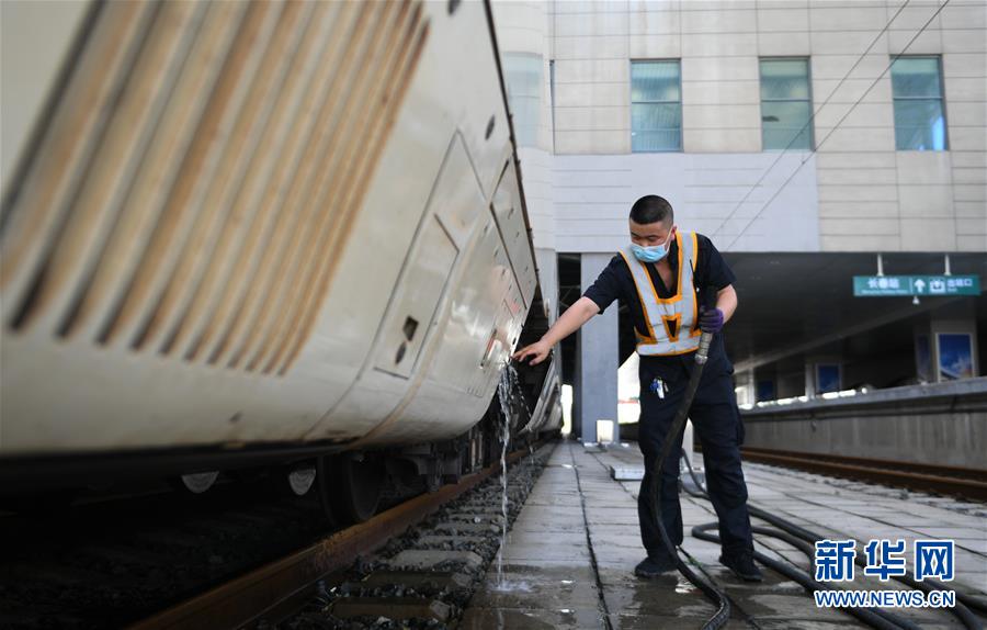 8月12日,長春火車站客運(yùn)車間上水工龔關(guān)在給列車上水。新華社記者 林宏 攝