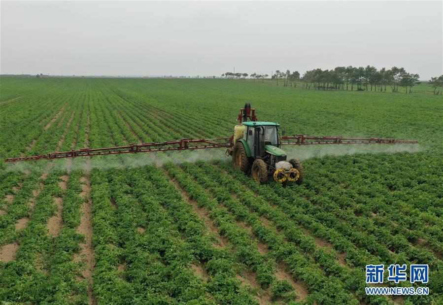 8月12日,在尚義縣三工地鎮有德元村,農民使用機械設備在田間給旱作馬鈴薯噴灑農藥(無人機照片)。