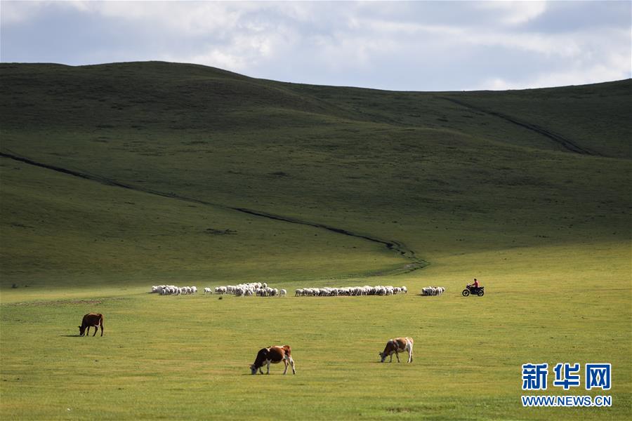 牧民在克什克騰旗貢格爾草原放牧(8月11日攝)??耸部蓑v旗位于內蒙古自治區赤峰市西北部,境內的湖泊、河流、草原、森林等自然景觀,讓人們流連忘返。新華社記者劉磊攝