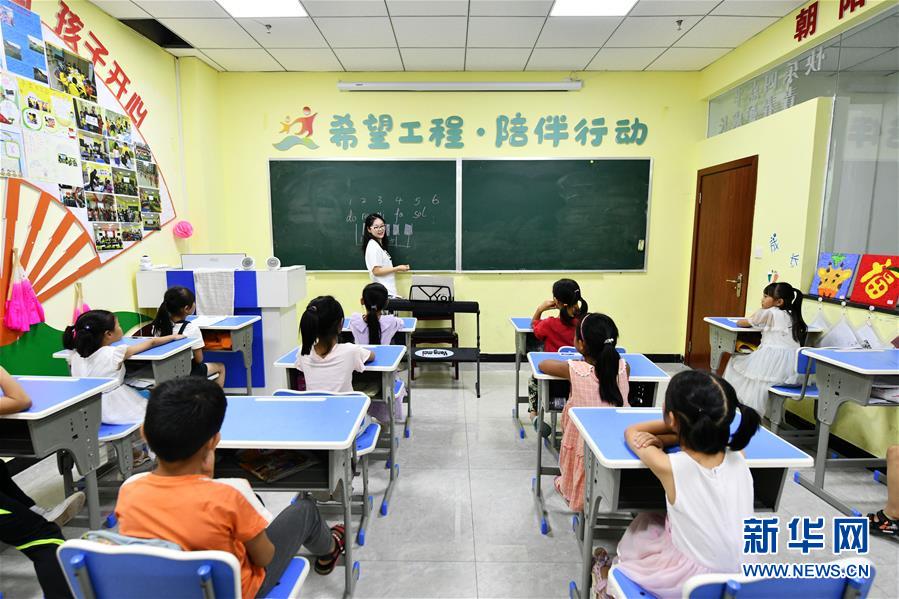 8月13日,在貴州省思南縣雙塘街道麗景社區易地扶貧搬遷安置點,志愿者在給孩子們上音樂課。今年暑假期間,在貴州省銅仁市思南縣雙塘街道麗景社區易地扶貧搬遷安置點,來自北京有研集團和思南當地的志愿者們利用暑期時間,給安置點的孩子們進行音樂、體育、手工、安全教育等課程輔導,幫助搬遷戶照看孩子,讓孩子們在學習中度過一個快樂而有意義的暑假。新華社記者楊文斌攝