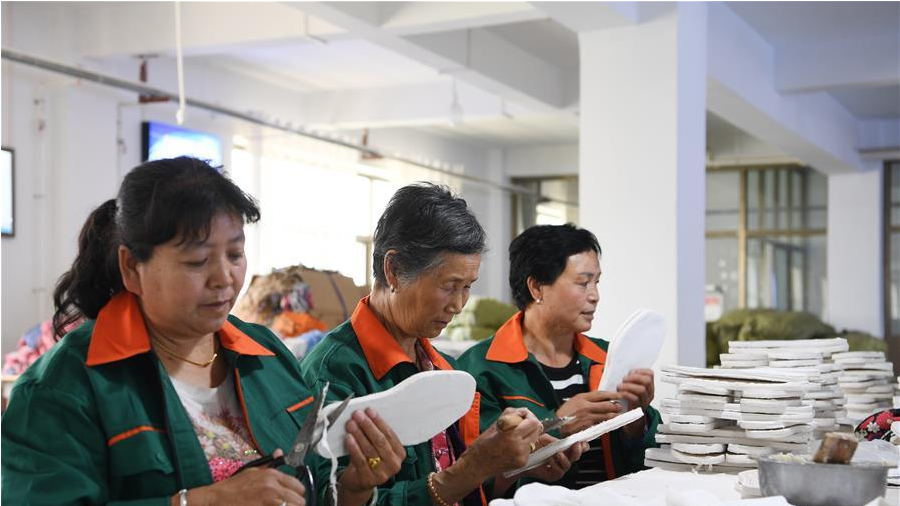 7月2日,臨夏縣百利布鞋加工農民專業合作社員工在加工布鞋。