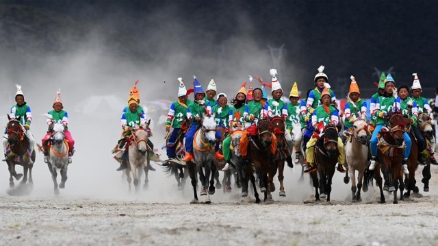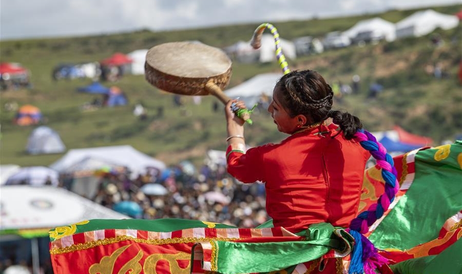 8月12日,2020中國碌曲鍋莊舞展演暨甘南藏族自治州第六屆少數民族傳統體育運動會在甘肅省甘南州碌曲縣夏澤灘草原上舉行。開幕式上,三千余名身著節日盛裝的演員和當地群眾在草原上起舞,雨后初晴的草原上充滿歡聲笑語。