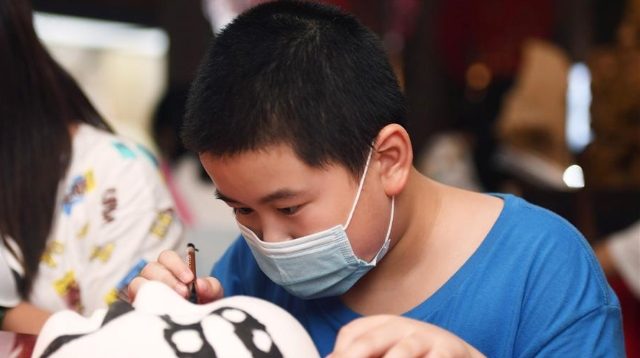 8月8日,小朋友在長沙市非物質文化遺產展示館體驗湘劇臉譜繪制。暑假期間,許多小朋友來到位于湖南省長沙市橘子洲景區的長沙市非物質文化遺產展示館參觀體驗。