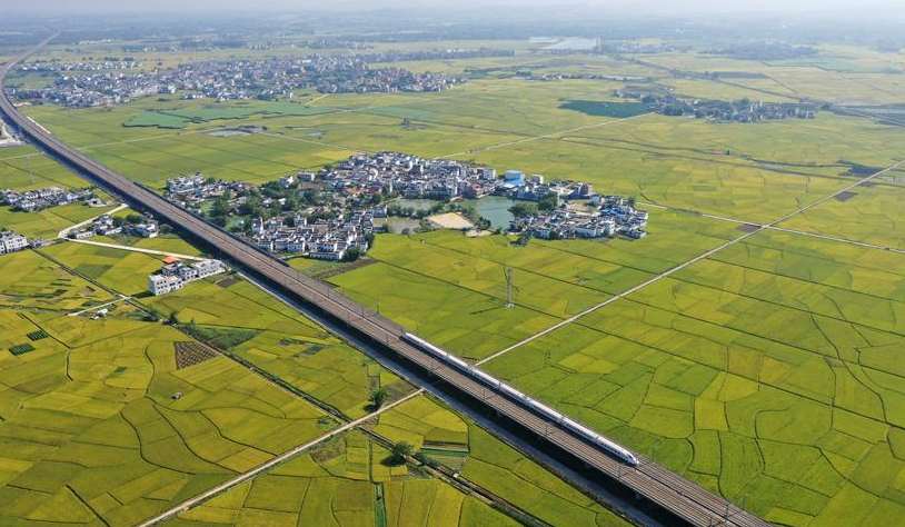 眼下,廣西賓陽縣古辣鎮大面積稻田進入收獲期,一列列南來北往的動車從稻田間飛馳而過,構成一幅幅美麗的豐收圖畫。