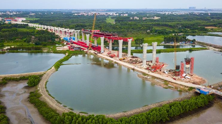 湛江調順跨海大橋的東岸主塔墩承臺日前順利建成,大橋步入主塔塔柱施工階段。
