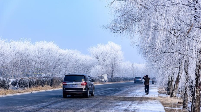 1月13日,107國道河北省定州路段出現霧凇(樹掛)景觀,吸引路人駐足拍照留念。