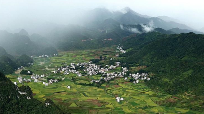 初秋時節,廣西隆林各族自治縣克長鄉田野鋪金,山青水綠,呈現出一幅清新的秋日畫卷。