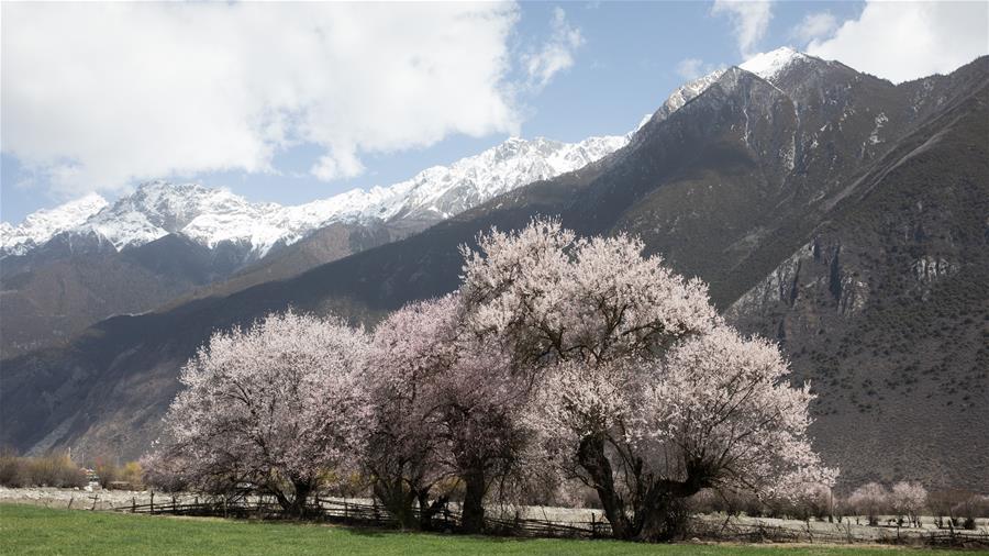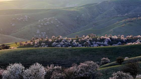 新疆天山腳下的霍爾果斯大西溝風景優美,山頂上白雪皚皚,山腳下春意濃濃。