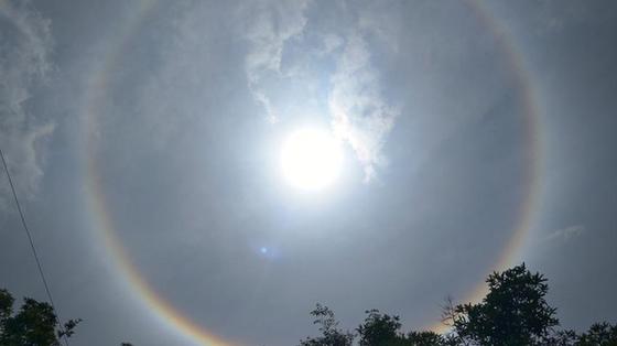 日照當頭,太陽周圍被一個碩大的光圈包裹,形成一幅絕美景象,網友驚呼“美到窒息”。