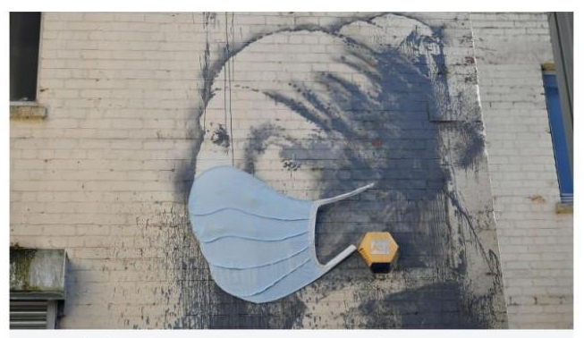 據英國天空新聞網23日報道,英國涂鴉藝術家班克西2014年曾在家鄉(xiāng)布理斯托爾一幢建筑外墻上,模仿17世紀名畫《戴珍珠耳環(huán)的少女》創(chuàng)作了涂鴉畫《穿耳膜的少女》。在新冠疫情背景下,少女現(xiàn)在又被“戴”上了藍色的醫(yī)用外科口罩。