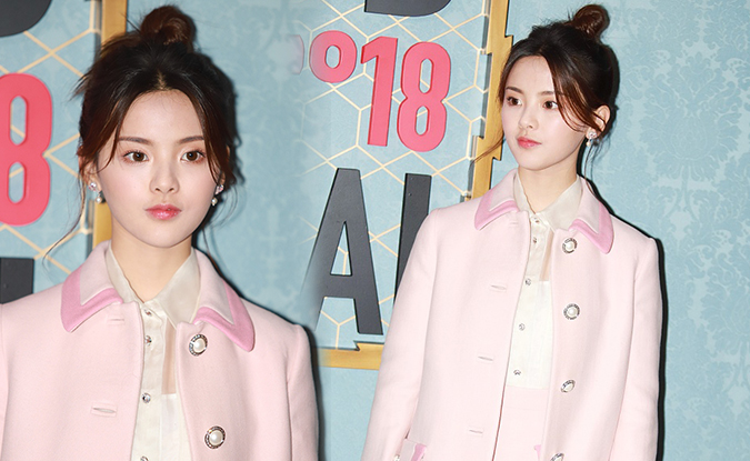楊超越穿粉色大衣嫻靜優雅 扎丸子頭顯活潑