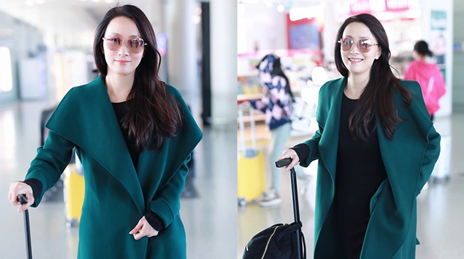 47歲陶虹獨自現身機場 穿綠大衣溫婉大方 面對鏡頭笑容親切