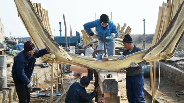 青島紅雙木造船廠是膠東地區(qū)保存下來的為數(shù)不多的傳統(tǒng)手工造船廠。廠里6位師傅都是制造木船的行家里手,年紀最小的也已50多歲。
