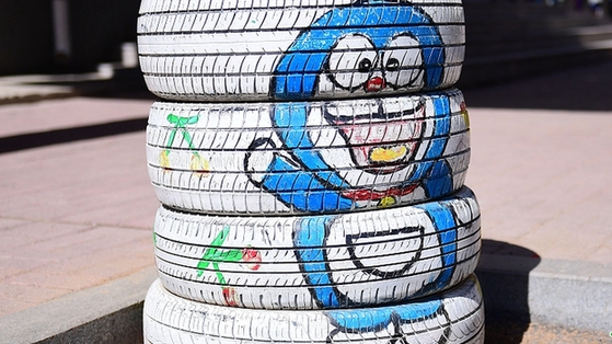 5月4日,二十余個印有卡通圖案及奧運五環(huán)造型等創(chuàng)意輪胎花盆亮相沈陽,吸引市民。多啦A夢卡通輪胎