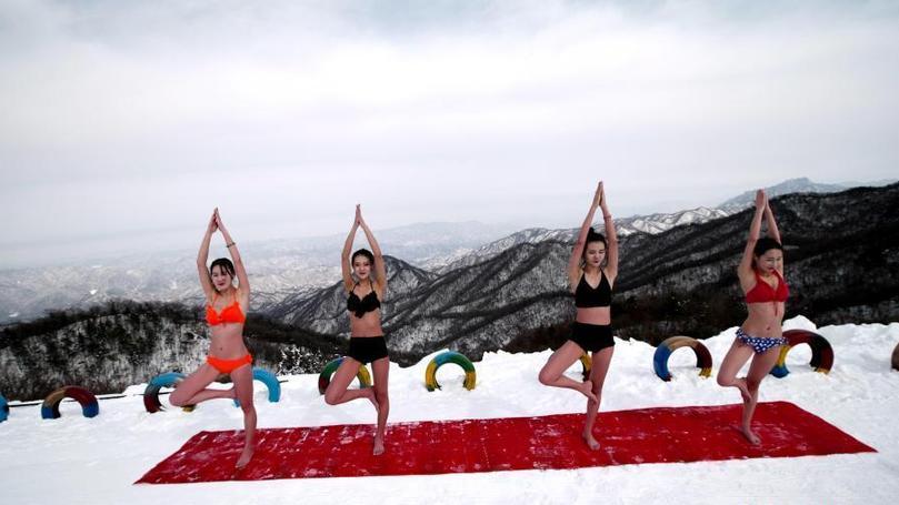 1月30日,河南欒川伏牛山滑雪場內,幾名比基尼美女寒冬天氣里在山頂練瑜伽、泡溫泉。