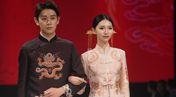 主題秀上展示大量帶有龍鳳、牡丹、海棠、彩蝶等中國傳統文化元素的宋錦中式婚慶禮服。