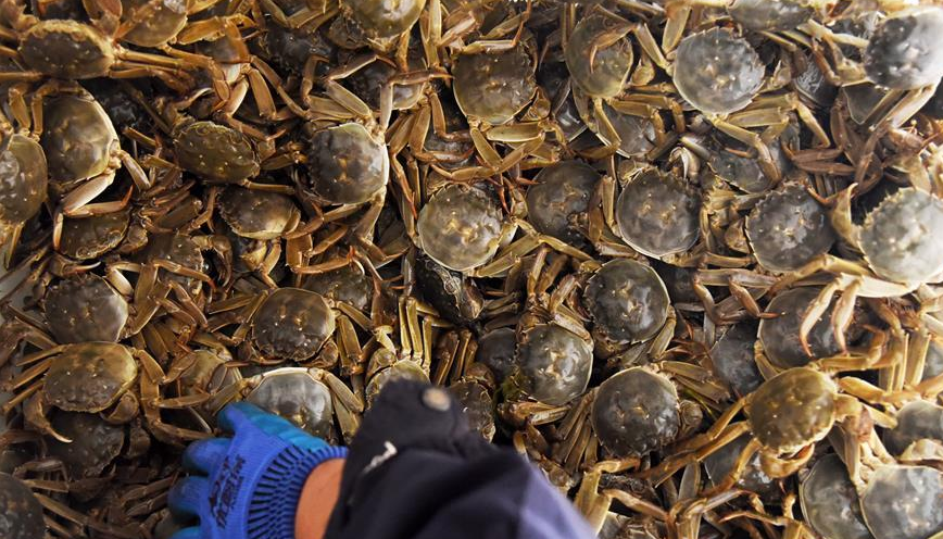 時下正值山東東營黃河口大閘蟹收獲的季節,各養殖區的工人們正在緊張進行大閘蟹的收獲、包裝作業,將產品銷售國內外市場。