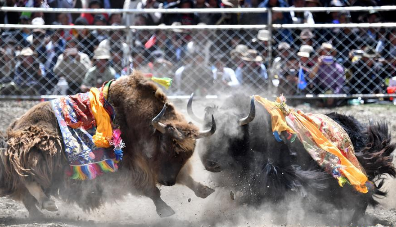 者下鄉斗牛節歷史悠久,是西藏自治區非物質文化遺產。牧民為參加比賽的種牦牛披綢掛緞,將牛群趕到位于日喀則市白朗縣者下鄉的斗牛場上。