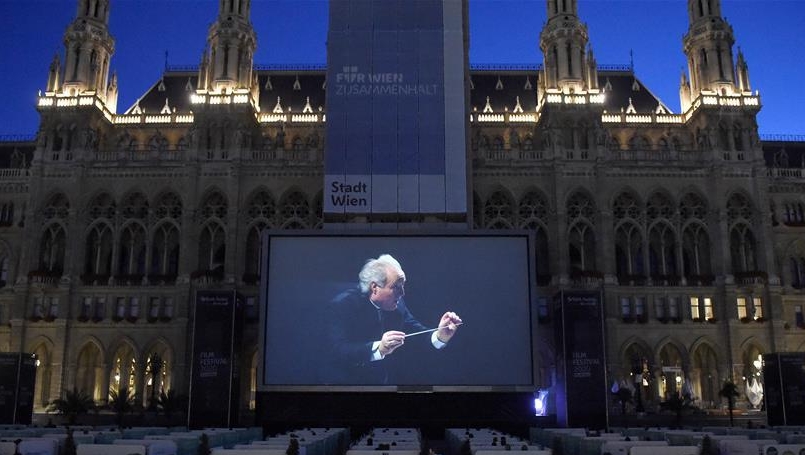 7月4日,觀眾們在奧地利首都維也納市政廳廣場內場一個個獨立小區域內觀看維也納電影節開幕電影——貝多芬的歌劇《菲岱利奧》。