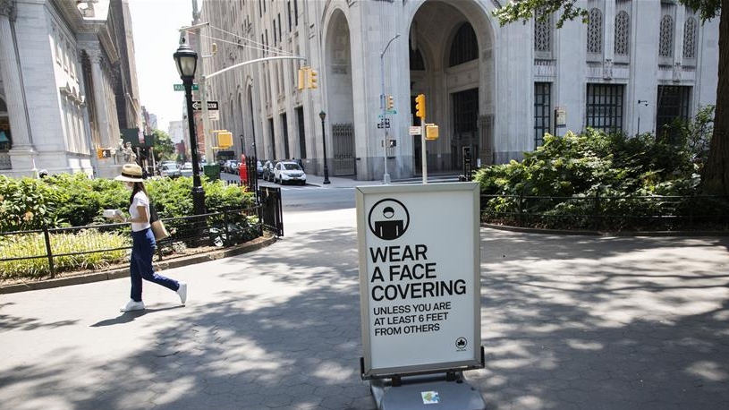 7月6日,行人走過美國紐約一處公園內的提示牌,上面寫有防疫須知和公園管理規定。